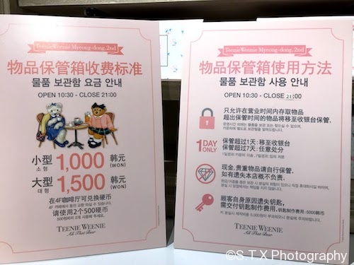 物品保管箱可以存放小包,也可以存放大包。小包1000韩元,大包1500韩元,营业时间(10:30-21:00)内有效。咖啡厅柜台可以兑换硬币,使用过程是放包-投币-锁门。
