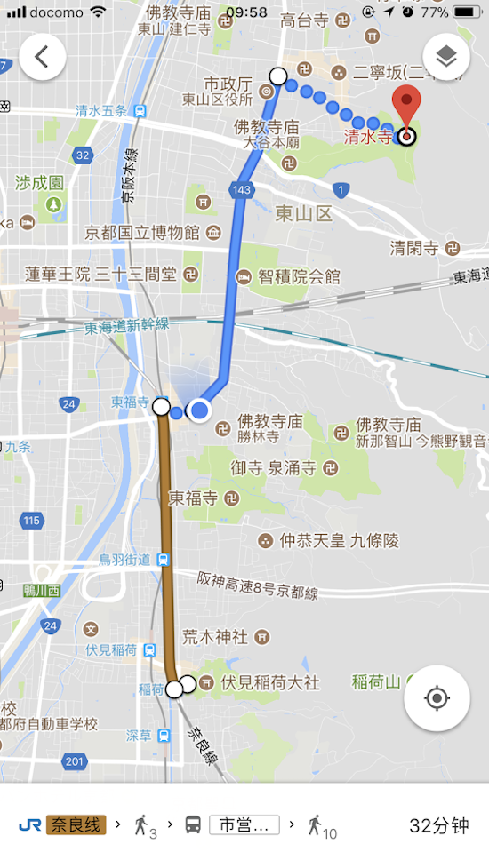 从伏见稻荷大社坐地铁到东福寺站,然后换乘202公交车到清水道站下车(20-30分钟),往身后方向走到红灯过马路,沿商店街一路走上去就是清水寺(5-10分钟)。