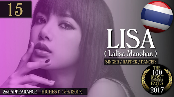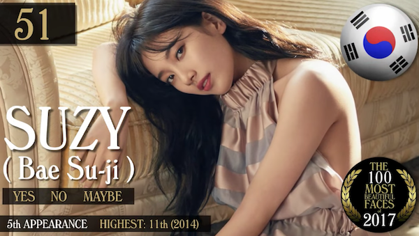 12月28日,美国网站TC Candler公布2017年全球最美面孔100人名单,菲律宾裔美国模特Liza Soberano夺冠。中韩两国艺人包括在韩国活动的外籍艺人中,中国台湾出身的韩国女团TWICE成员周子瑜排名最高,位列第3。