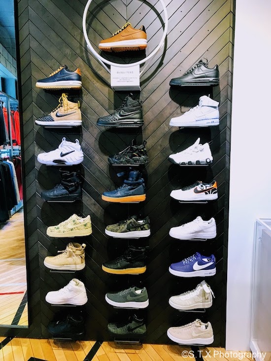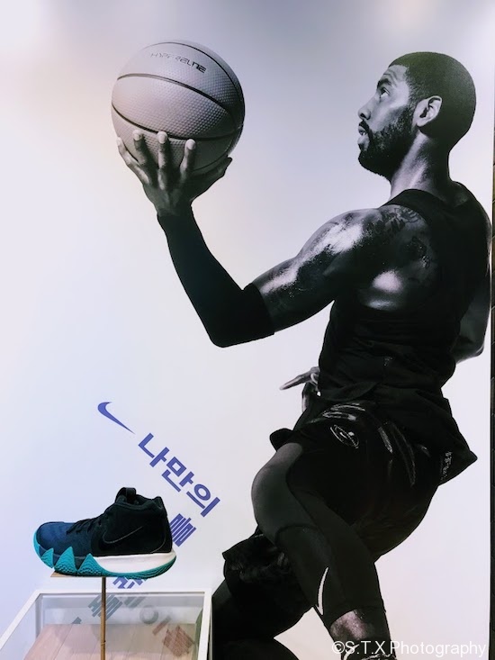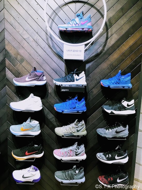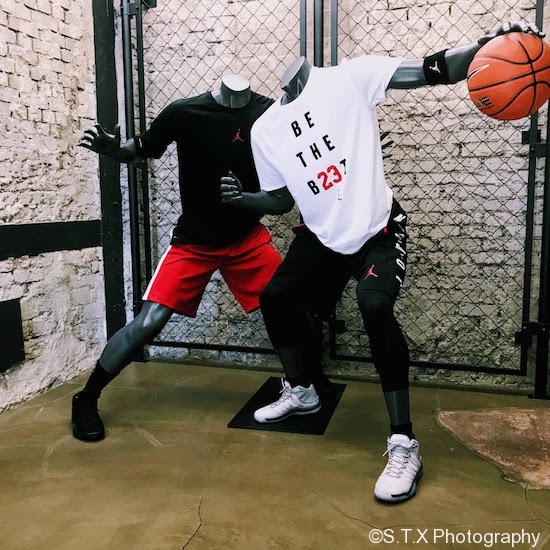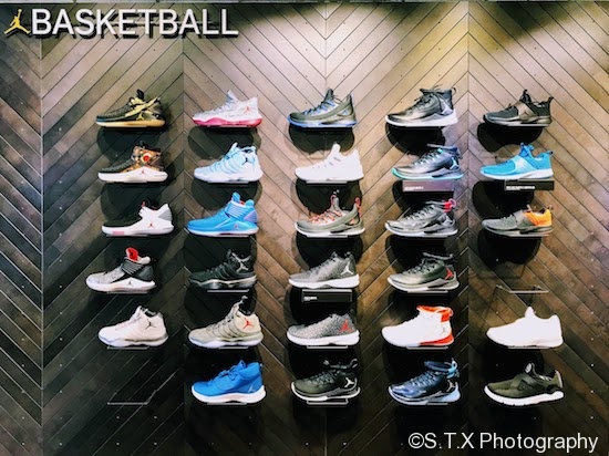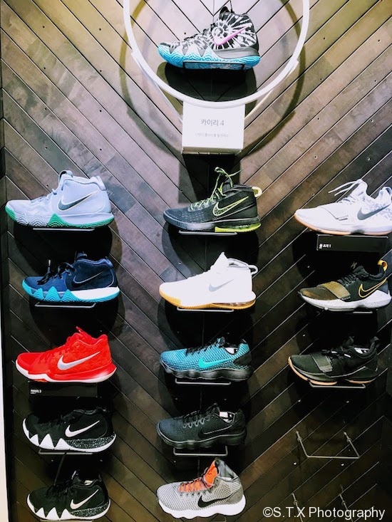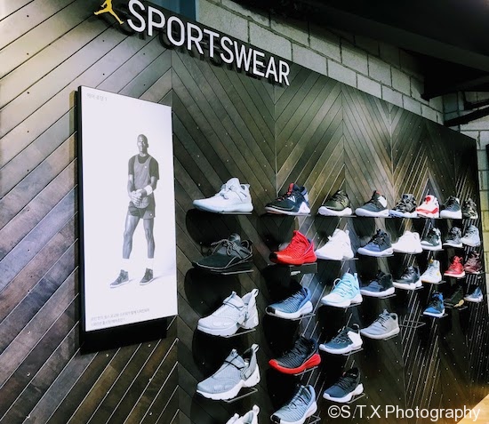 梨泰院乔丹旗舰店的卖场共有两层,一楼是耐克篮球用品,包括金州勇士队的球衣、克利夫兰骑士队的球衣、凯里·欧文(Kyrie Irving)系列篮球鞋、凯文·杜兰特(Kevin Durant)系列篮球鞋等;二楼则是乔丹系列的服饰、帽子,以及各代篮球鞋等。