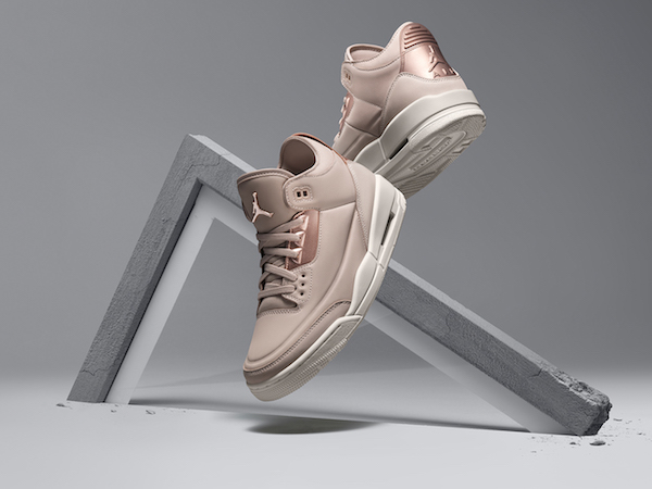 甜美色系,女神专属!鞋身以粉色磨砂皮革呈现,鞋带扣、后跟位置采用香槟金点缀,AJ3 标志性的爆裂纹并未出现,鞋舌 Jumpman Logo 和细节的光泽表现,反而使整体视觉上更为简约大气,上脚的休闲搭配效果必定不俗。