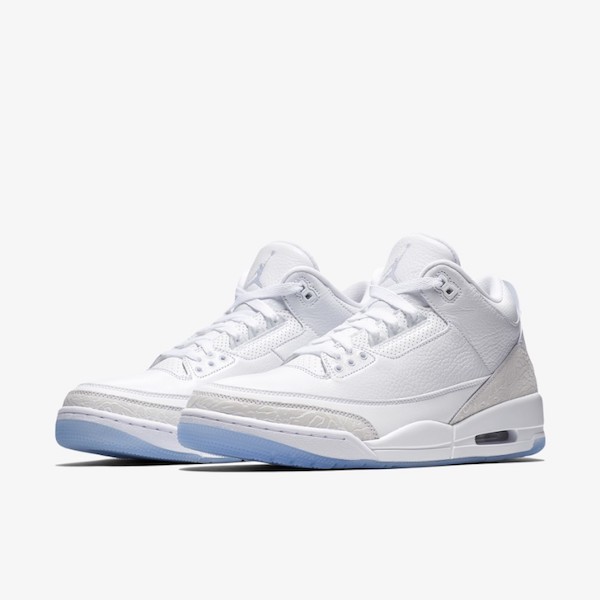 Air Jordan 3 Pure White于5月5日率先在中国区发售过了。这双鞋纯白基调下又有精致的细节装饰,依然保持了爆裂纹的经典元素,纯色色调也进一步凸显了皮革材质的华丽质感。鞋舌处的 Jumpman Logo 由金属质感的银色线刺绣而成,勾勒出飞人的经典身姿。鞋底改为淡蓝色的水晶外底,为纯白的鞋身又增添了几分独特的活力效果。