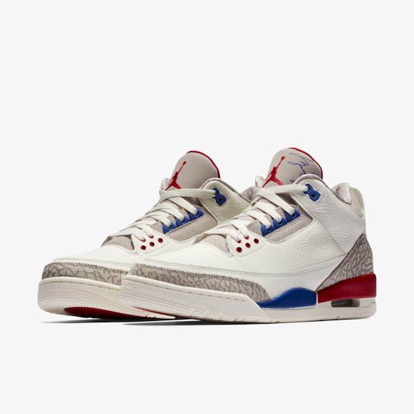 Air Jordan 3 “International Flight”以Michael Jordan在1988年参加的一场慈善比赛为灵感,以美国队的蓝红色调为主题,整体以白色为主色调,细节蓝红装饰别具动感效果。经典的爆裂纹饰得以保留,在银灰色的左鞋鞋舌上,还带有 MJ 的签名!