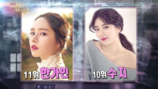 10.裴秀智、9.孙艺珍、8.丁允姬、7.金憓秀、6.全智贤、5.金妍儿、4.金喜善、3.李英爱、2.宋慧乔(正确汉字名:宋慧教)、1.金泰熙(正确汉字名:金泰希)