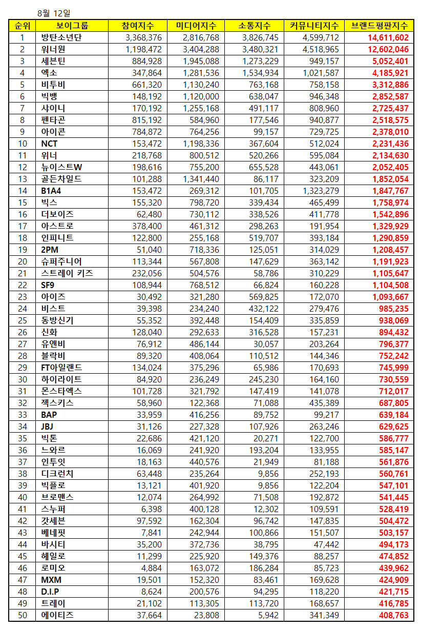 8月12日,根据韩国企业评价研究所发布的8月份韩国男团品牌价值指数分析结果,防弹少年团继续蝉联榜首,Wanna One同样位居第二,Seventeen紧随其后排名第三。