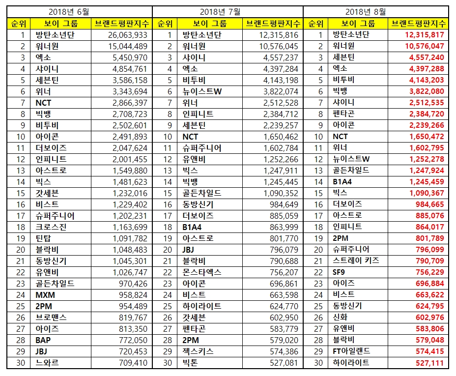 韩国企业评价研究所分析了从7月10日到8月11日期间男团相关的8849万6475个大数据,按照消费者的品牌价值参与量、沟通量等对沟通价值、参与价值、媒体价值、社会价值等进行评测,得出8月份韩国男团品牌价值排名TOP30如下 (点击名字进入相关页面):