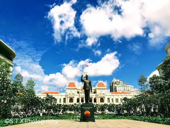 胡志明市政厅前有个广场,伫立着胡志明的铜像。往前一直走,就会看见西贡歌剧院、金融塔、咖啡公寓等,而红教堂、中央邮局等则在它的后方位置。