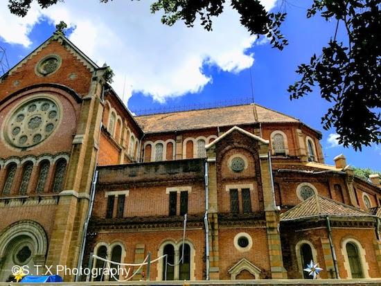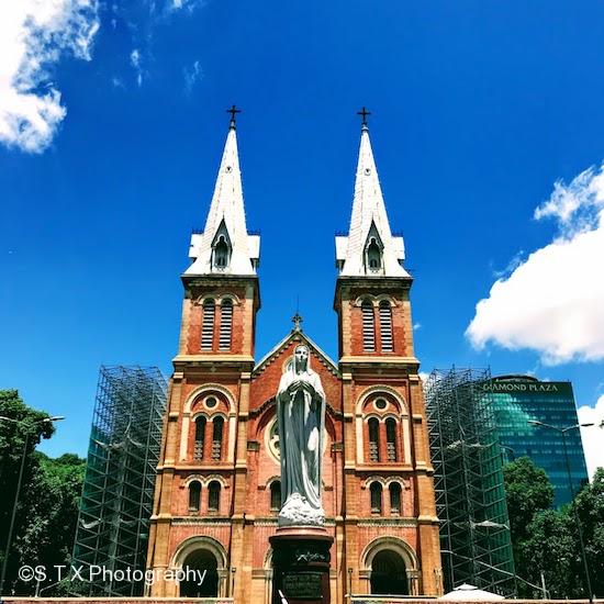 红教堂是胡志明市的另一个地标建筑,中央邮局就在其左侧。 教堂原名为西贡王公圣母教堂,因其使用红砖建造故而得名。建造所用红砖全部从法国运来,百余年过去,色泽依然鲜明。据悉教堂是仿照巴黎圣母院钟楼的设计,前方有一座重达四吨的圣母玛丽亚雕像。红教堂没有开放,门前有工人正在作业。