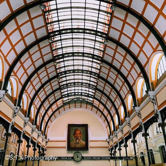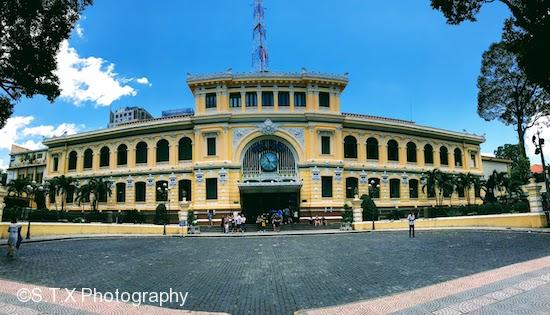 中央邮局建于十九世纪末,为法国建筑师设计。大厅内装饰华丽,极富古典气息,最醒目的位置挂着大型胡志明画像。宽阔的大厅两侧是业务柜台,中间是出售旅游纪念品、越南香水的柜台,很多游客都会来这里邮寄明信片。
