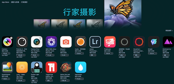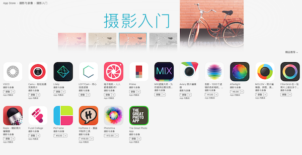 苹果官网推出了全球作品廊版块,用于展示来自 iPhone 6 的优秀摄影作品;苹果商店里摄影摄像类App按照入门和专业两个专题进行了分类推荐。